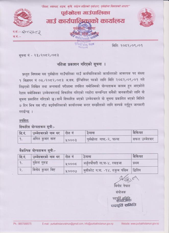 अ.सब.ईन्जिनियर पदको नतिजा प्रकाशन गरिएको सूचना।