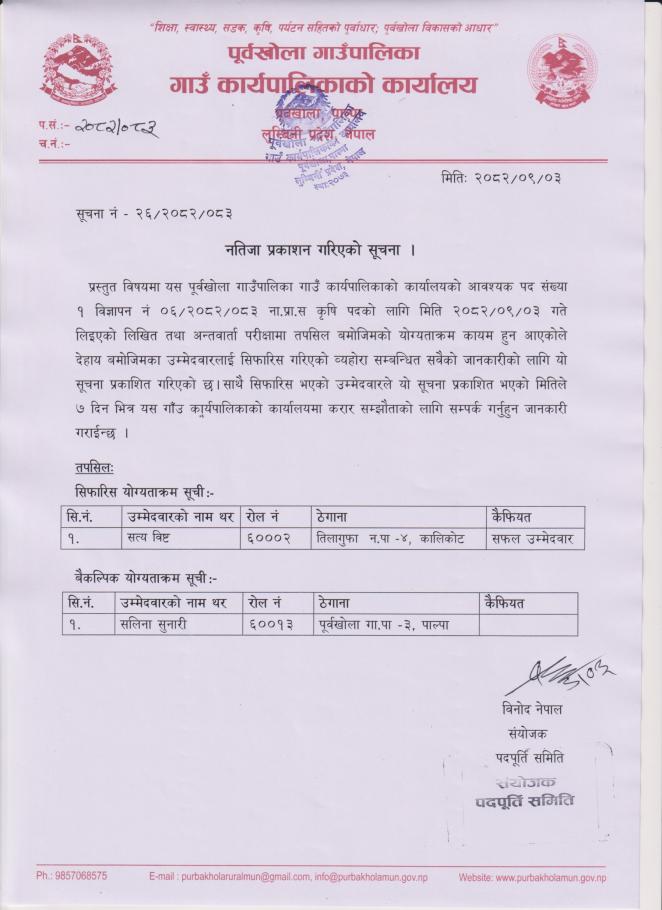 ना.प्रा.स. कृषि पदको नतिजा प्रकाशन गरिएको सूचना ।
