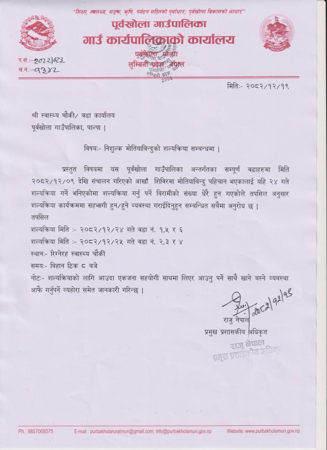 निशुल्क मोतियाबिन्दुको शल्यक्रिया सम्बन्धमा।